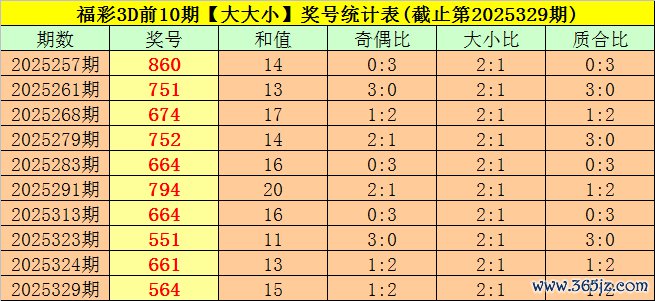 二、福彩3D上期开出奖号564,奖号大小比为2:1,大小类型开出【大大小】,该类型组合奖号在前9次诀别开出号码:860-751-674-752-664-794-664-551-661;